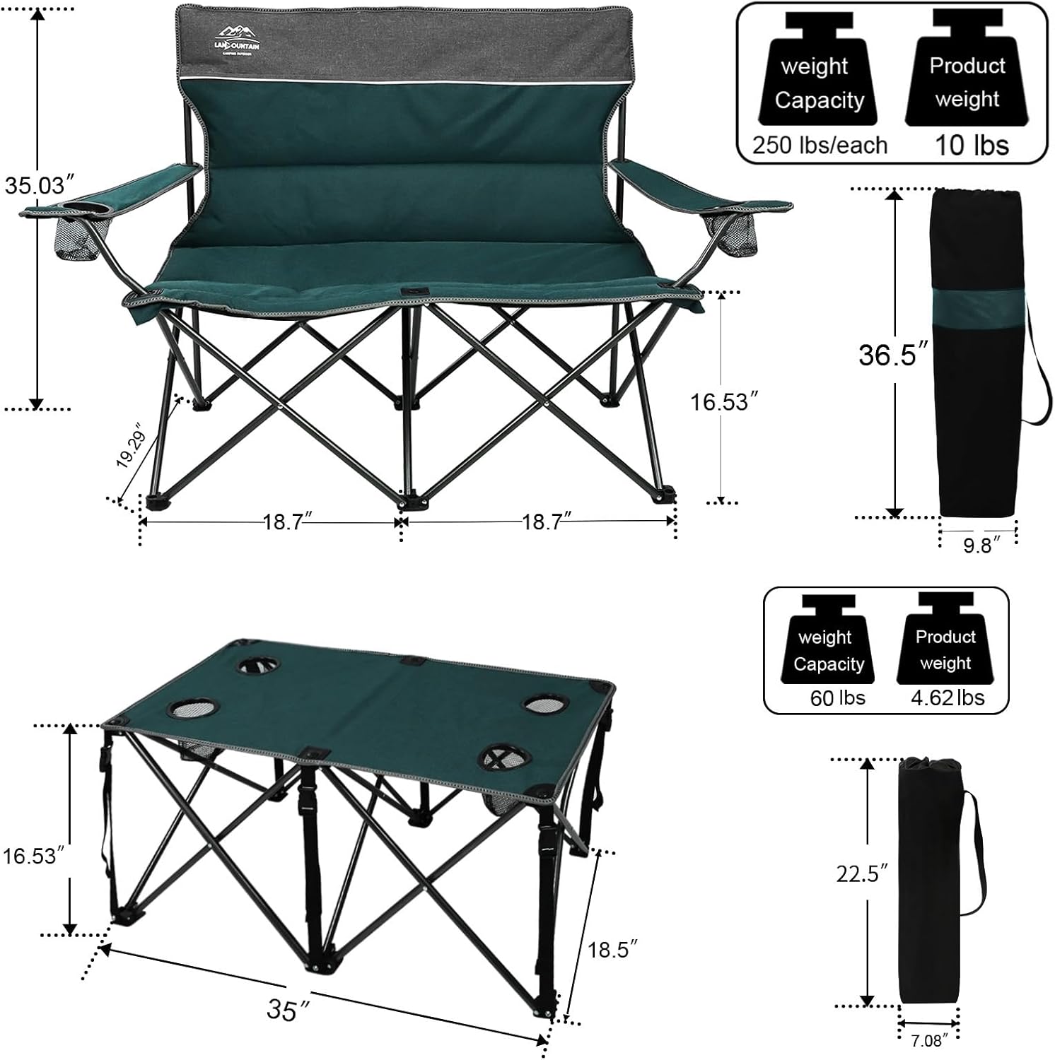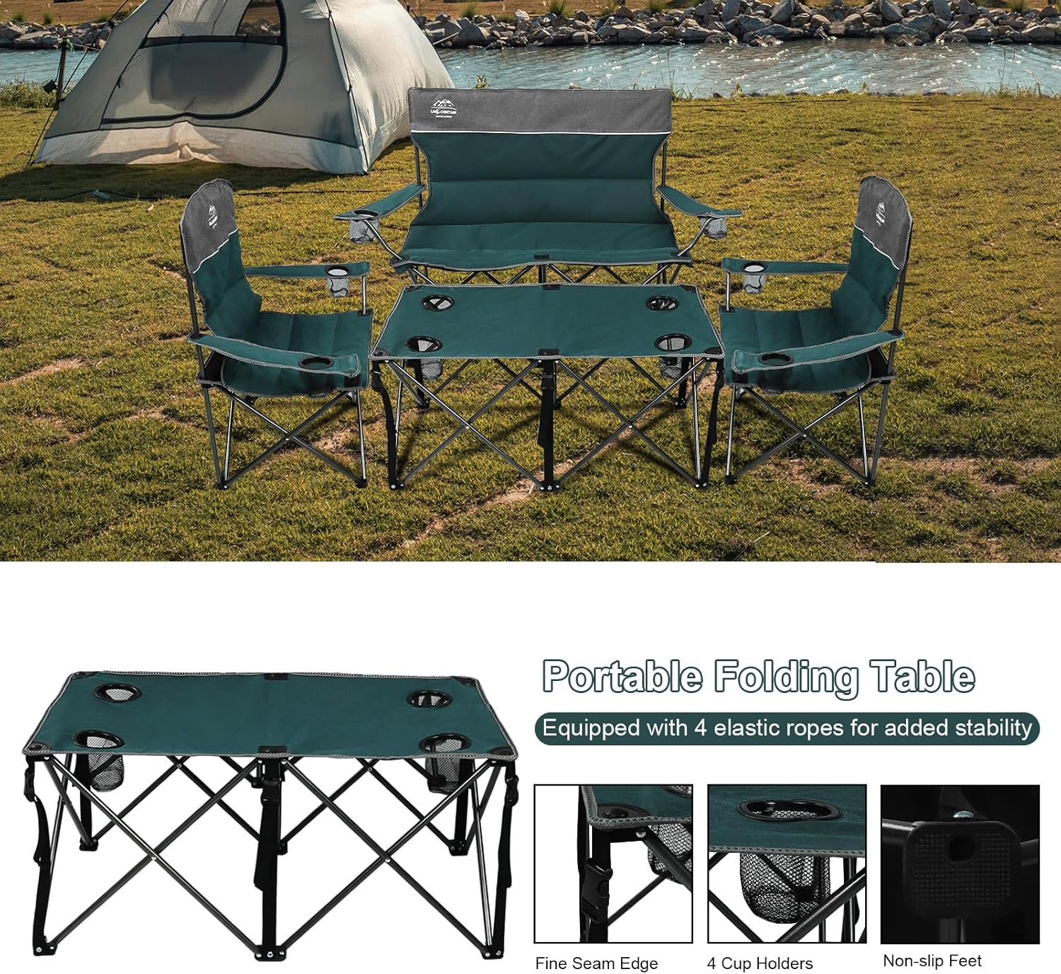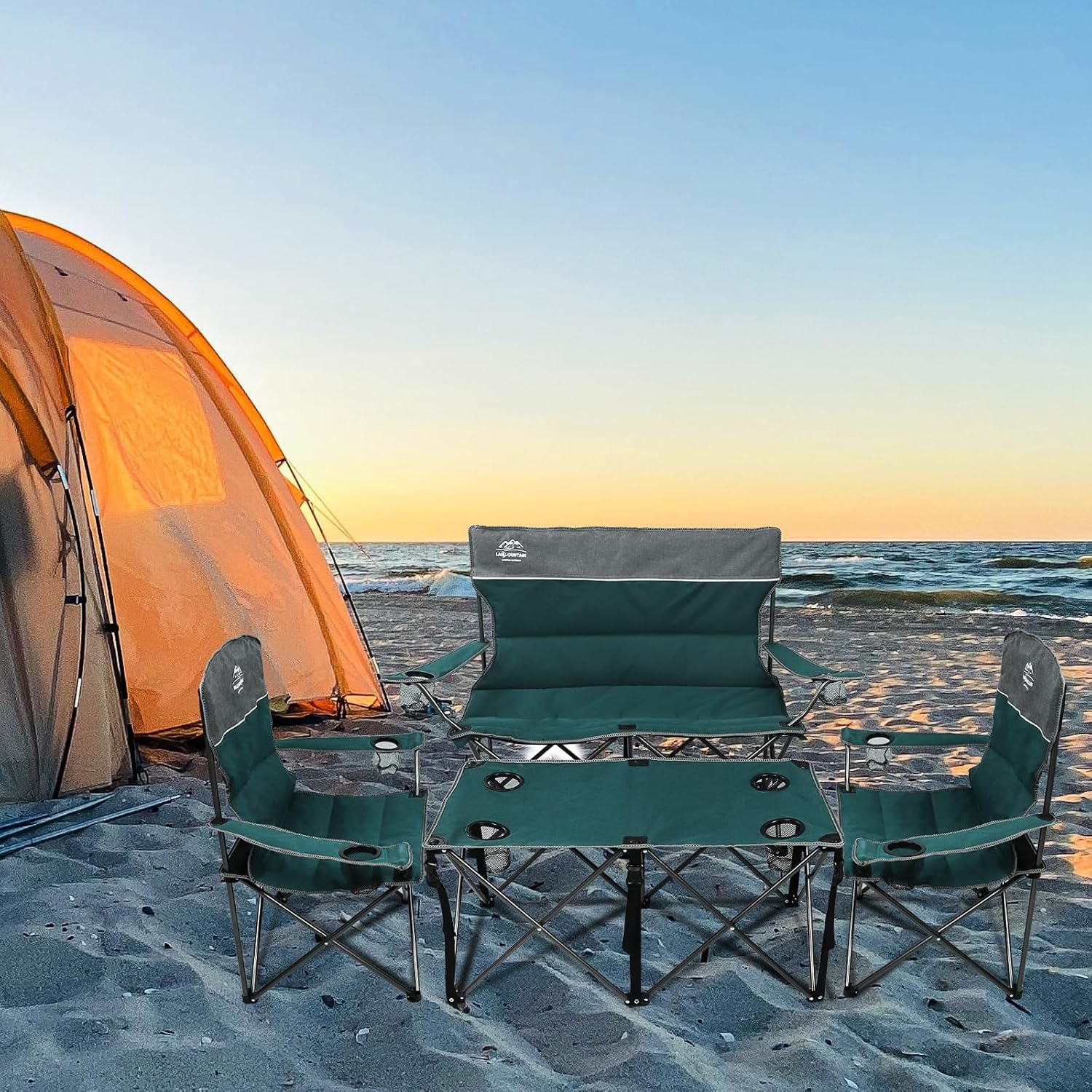 Oversized 4 Pcs Camping Chair Set with Table,Outdoor Folding Heavy Duty Lawn Chair,Cup Holder,Portable,Loveseat Chair Perfect for Family Hiking,Picnics and Beach Trips,Bistro Green