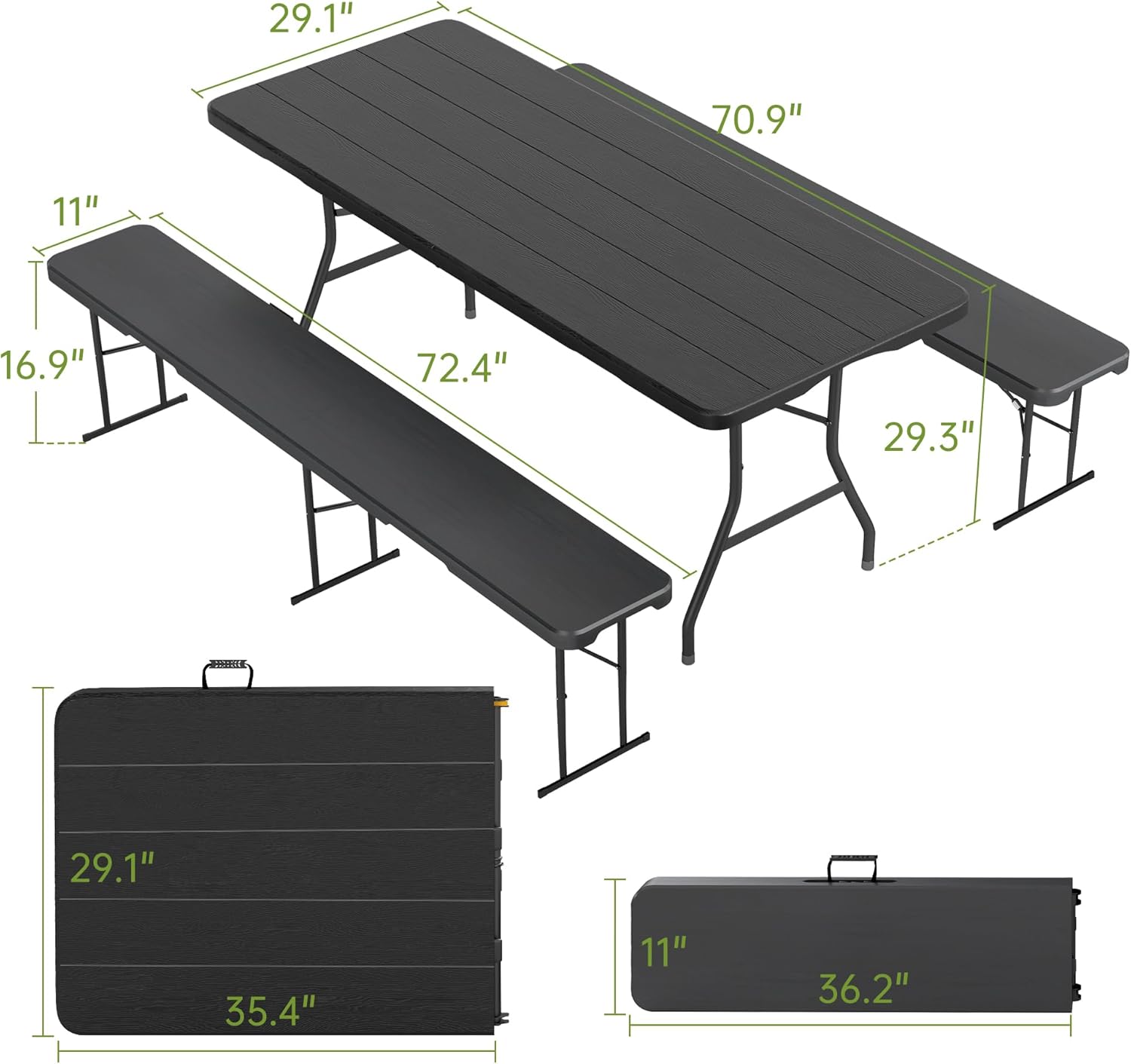 Real Relax 6' Picnic Table with 2 Benches, 3 Piece Black Wood Grain Portable HDPE Folding Camping Table and Benches for Courtyard, Garden, Outdoor Leisure, Party